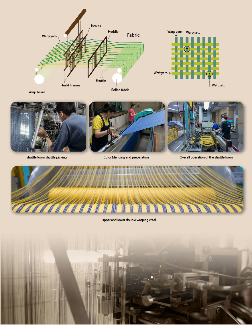 fabric structure. The warp yarn is separated into upper and lower layers, allowing it to be interlaced with the weft yarn to form the fabric.
