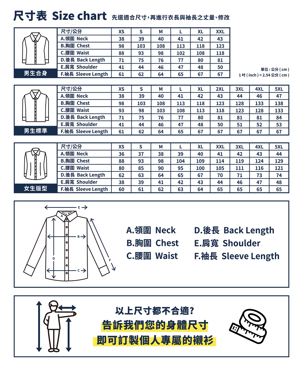 特殊體格下單前歡迎來訊跟我們討論您的想法,也可以拍照讓裁縫師參考您的身形以利製作